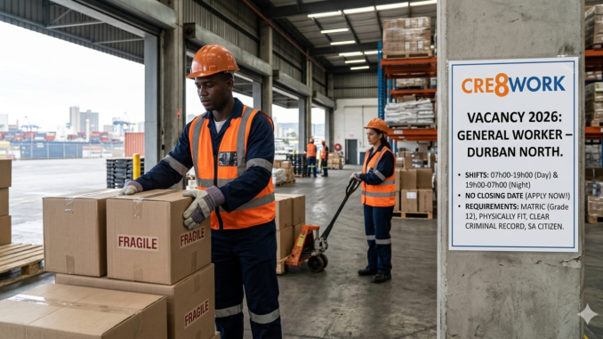 General Worker Jobs Durban North 2026, Cre8work Jobs South Africa, Manual Labour Jobs KZN, Warehouse Jobs Durban, Matric Jobs South Africa, Shift Work Jobs Durban
